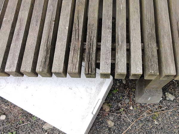 屋根はスレート屋根(コロニアル屋根)ですが、こちらも状態が良く、クラックも無く建材の状態は申し分ありません。ただし、苔が生えてしまっていることと、使わなくなったテレビアンテナからのサビがスレート板へと広がり美観的に良くありません。また縁台は雨水がダイレクトに当たるため酷い状態です。