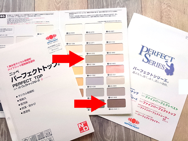 ご相談のうえ、4種類の塗り板(外壁のパターンに似せた、A4程度の大きさの色見本)を取り寄せ、実際の外壁で検討いたしました。